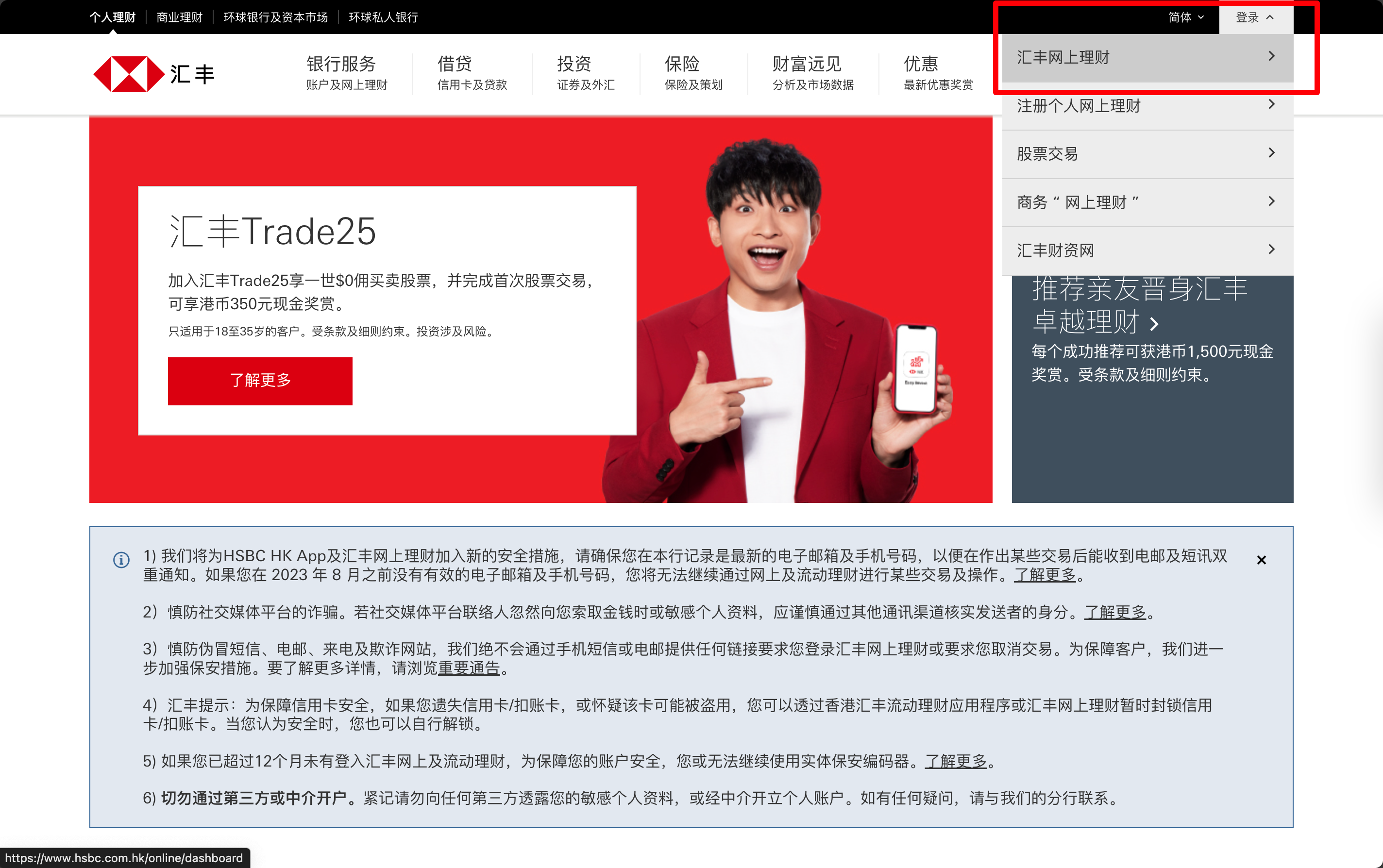 在右上角找到「登录」按钮,悬浮在上方之后可以看到「汇丰网上理财」: